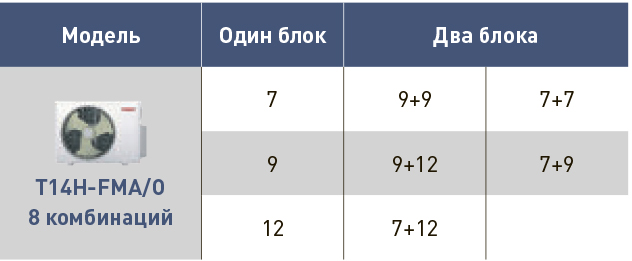 Общая площадь охлаждения до 40 кв.м, комбинации внутренних блоков подбираются индивидуально.