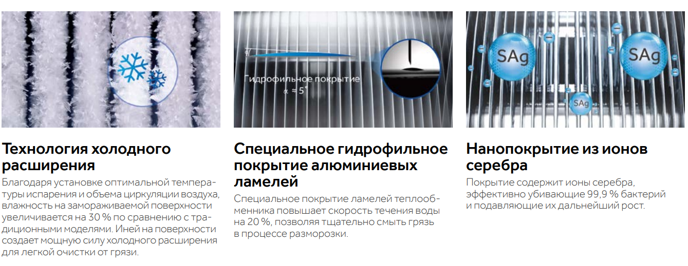 • Ag+ покрытие испарителя и корпуса внутреннего блока — против образования плесени и грибка, и размножения бактерий.