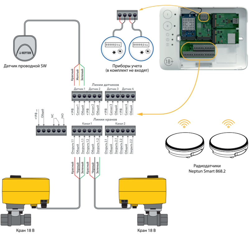 Краны Neptun Bugatti Pro 1/2" 18В – 2 шт. Радиодатчик Neptun Smart 868.2 – 2 шт. Датчик Нептун SW 005 – 1 шт. Модуль управления Neptun Smart +18 – 1 шт. Модуль расширения Tuya. Блок питания 18В – 1 шт.