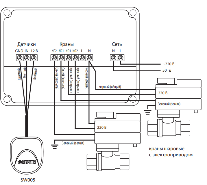 Схема подключения датчиков, кранов с электроприводом серии Neptun Bugatti Pro 220 В к модулю управления Neptun Base
