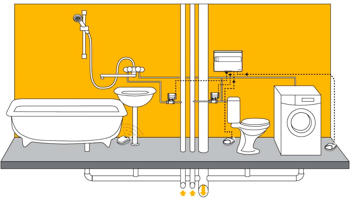 • Датчик, установленный в местах вероятного скопления воды, обнаружив протечку, подает сигнал на модуль управления системой;