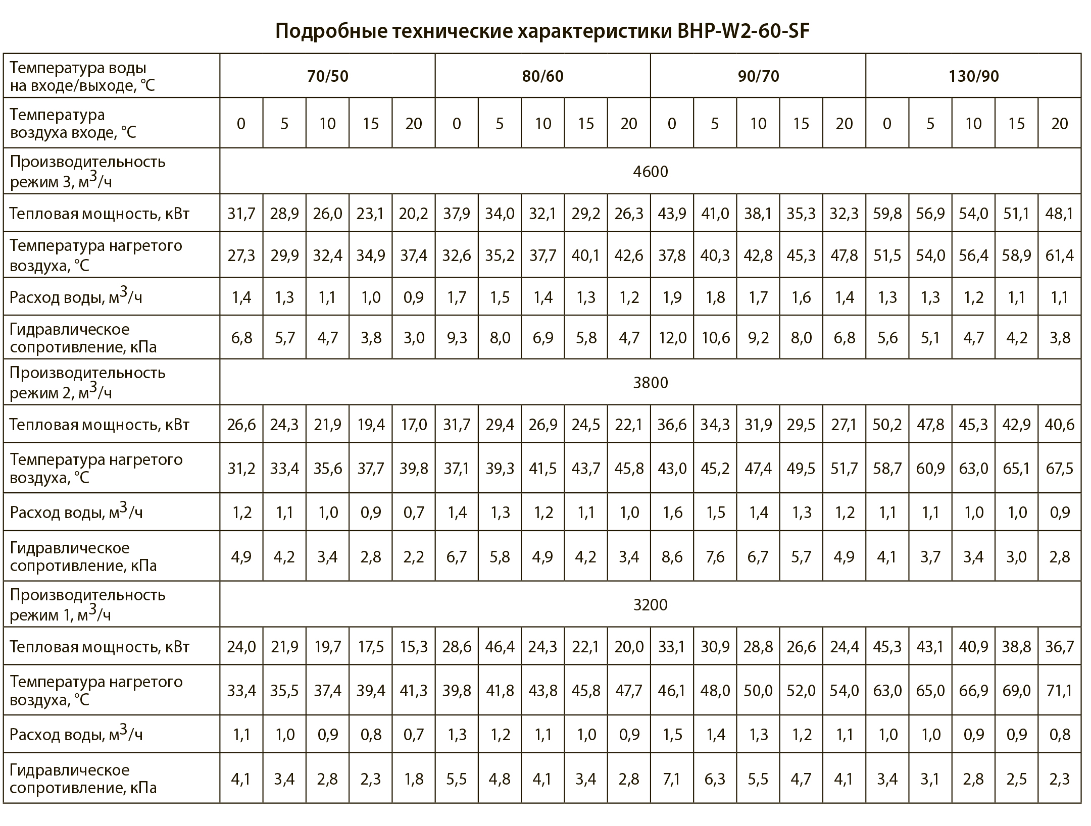 Тепловые характеристики приведены при температуре воздуха на входе +0 °С, максимальном расходе воздуха и максимальной температуре теплоносителя (указанной в таблице тепловой мощности от производителя).