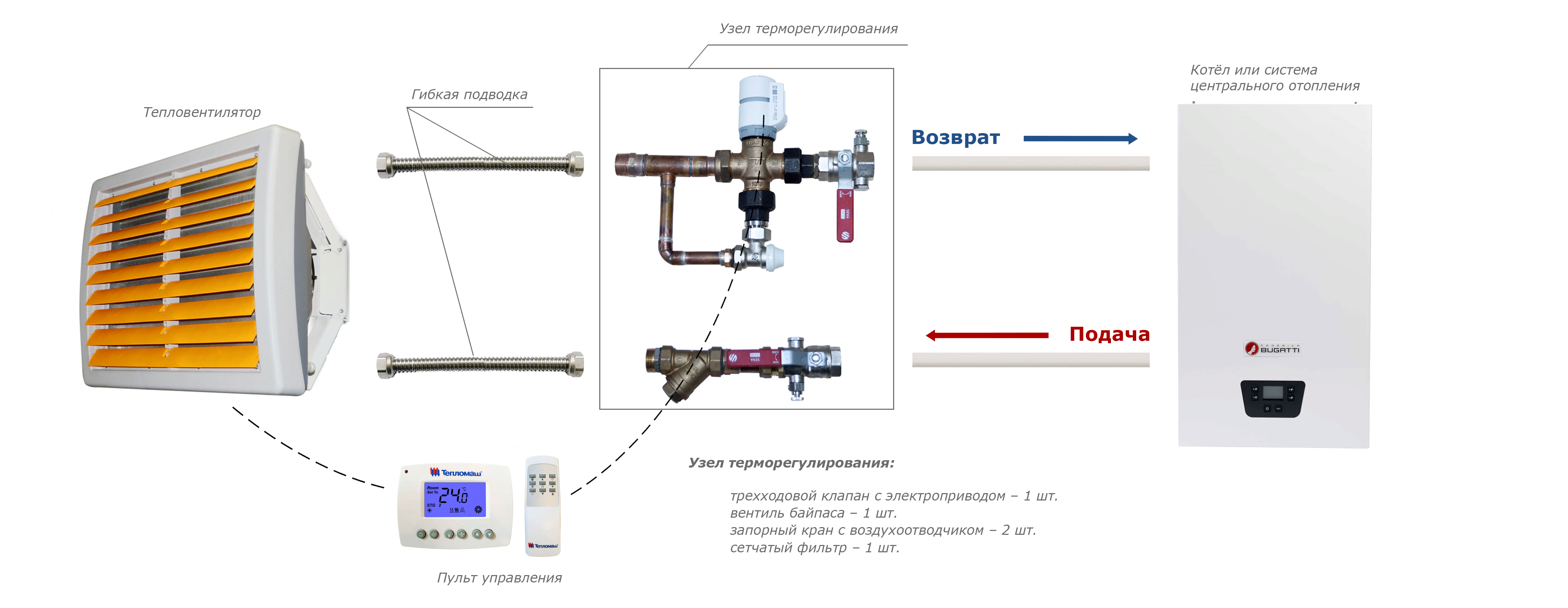 • Стандартная комплектация: тепловентилятор + проводной пульт HL10 с электронным термостатом — поддержание заданной температуры осуществляется за счет включения/выключения вентилятора и его работы на выбранной скорости. При достижении необходимого уровня температуры вентилятор отключается, теплоноситель продолжает циркулировать.